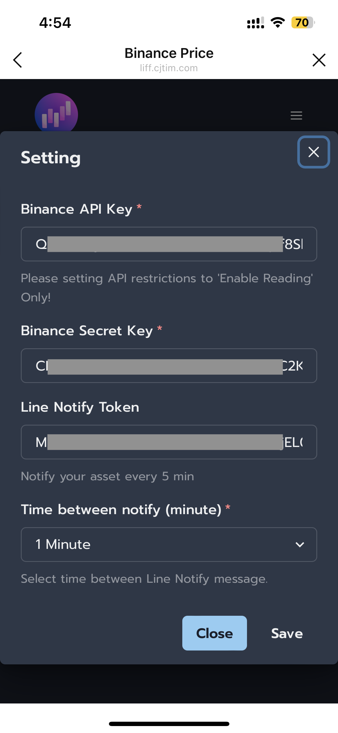 - Paste your Binance API key and LINE Notify key.