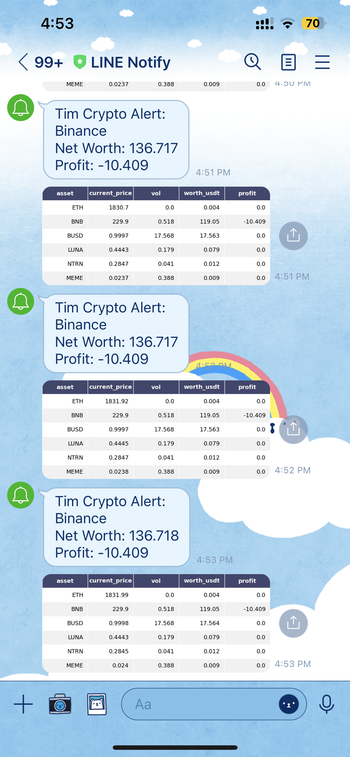 - Python and Pandas - Responsible for creating Excel pictures and streaming binary data to the LINE Notify API. https://github.com/cjtim/line-notify-binance-asset